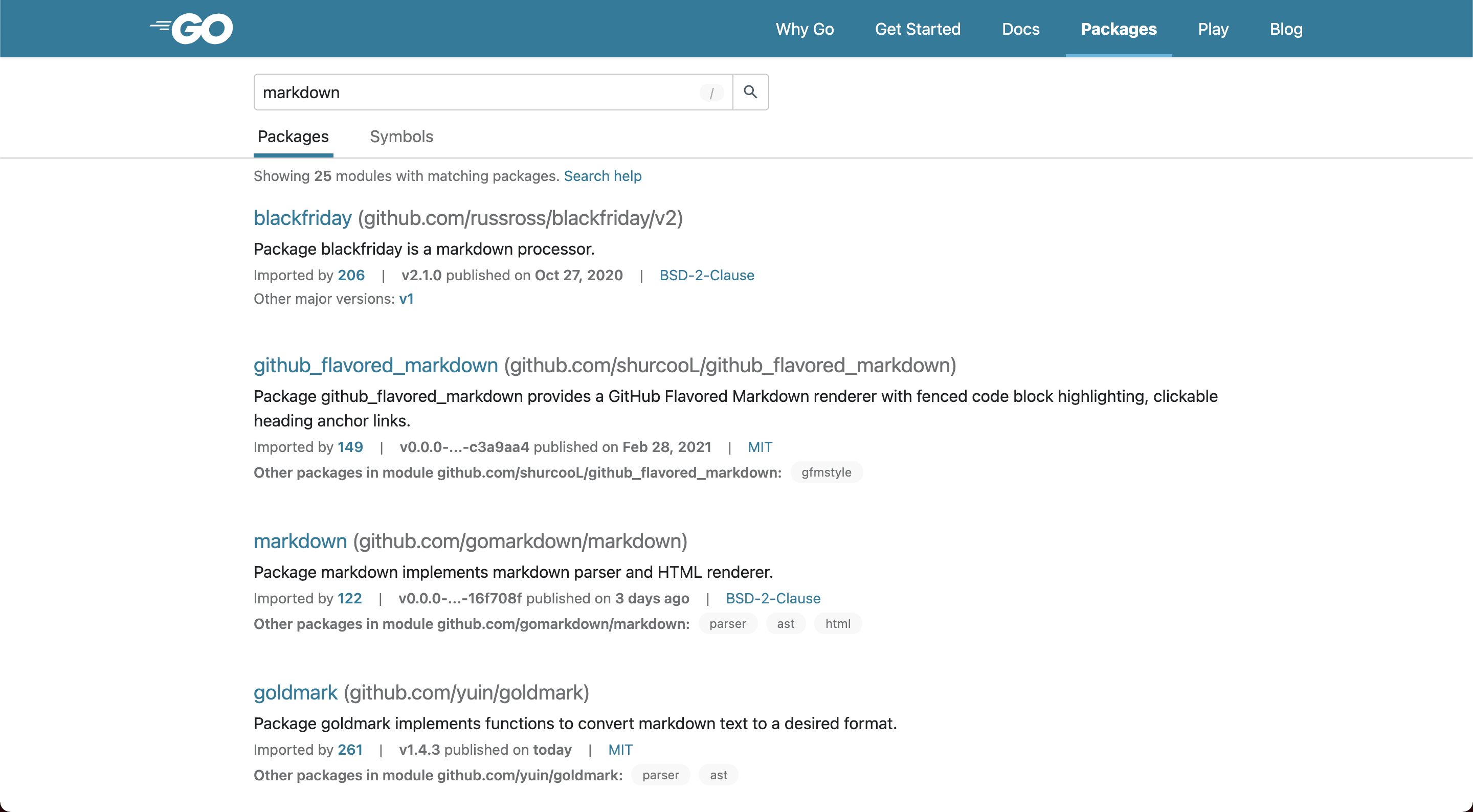 Search results for packages in the same module are now grouped together. The most relevant package for the search request is highlighted. This change was made to reduce noise when several packages in the same module may be relevant to a search. For example, searching for “markdown” shows a row listing “Other packages in module” for several of the results.